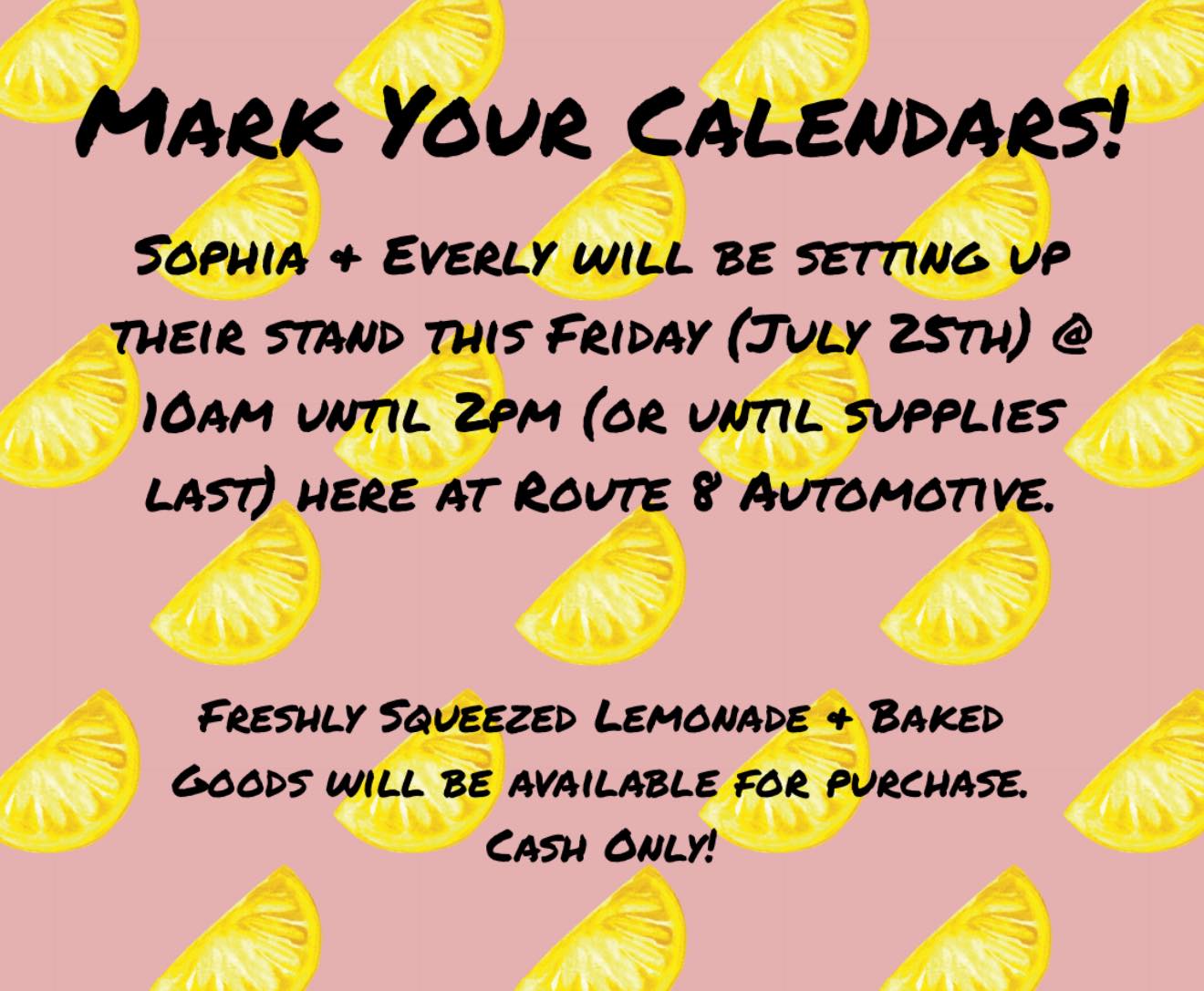 Sophia & Everly will be setting up their lemonade & baked goods stand this Friday (July 25th) from 10am-2pm here at the garage. Cash only! Come enjoy customer appreciation day. All proceeds to Log-A-Load For Kids.