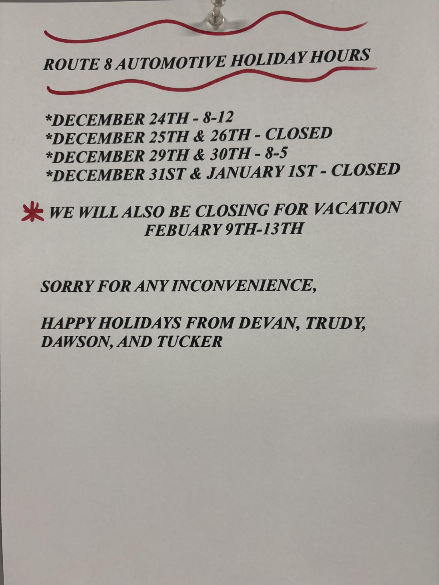 Please review our modified holiday hours. We will also be closing for vacation from **February 9th - 13th, 2026**. Happy Holidays from Devan, Trudy, Dawson, and Tucker!
